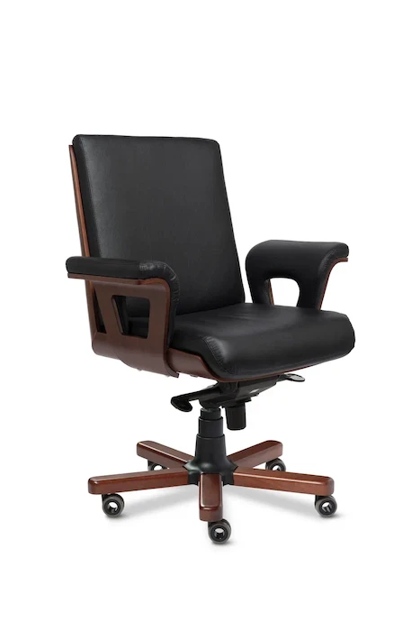 Кресло посетителя Cadis В - новая и эксклюзивная модель из натуральной кожи премиум класса, выполняется с низкой спинкой без подголовника. Спинка и сидение уложены в фанерованный ковш, облицованный пластиком. Пластик - имитация текстуры ценных пород древесины. Дизайн кресла лаконичен, сочетает в себе строгость и элегантность. Кресло оборудовано механизмом качания с регулировкой под вес и фиксацией в четырёх положениях ("Мультиблок"), а так же регулировкой высоты за счет установленного в крестовине кресла газо-масляного амортизатора (газпатрона) 3-ей категории стабильности (DIN 4550 class 3), категория повышенной надёжности: газпатрон выдерживает нагрузку в 200 тысяч циклов при динамической стендовой нагрузке в 80 кг. Максимальное давление, при котором срабатывает газпатрон - около 150 кг. Толщина поролона на сиденье и на спинке 80 мм. Применяемая марка поролона 30/40 (плотность/жесткость) обеспечивает долговечность кресла. Каркас кресла выполнен из высокопрочной гнутоклееной фанеры. Чехол кресла выполнен из черной или цветной мебельной, натуральной кожи сквозного крашения со среднезернистым тиснением из цельных шкур крупного рогатого скота, задняя часть спинки по евростандарту из кожзама (компаньона) в цвет кожи. Толщина шкуры в стандартной точке 0,9-1,1мм. Также чехол может быть выполнен из экокожи ("Орегон") или микровелюра. Для придания объемности и правильной эргономики чехла кресла - применяется холофайбер ( марка 400). Спинка и сидение гладкие, не имеют строчек или утяжек. Все указанные материалы экологичные и износостойкие - высшего качества. Подлокотники кресла изготовлены из гнутоклееной фанеры, с внешней стороны облицованы пластиком. Пластик - имитация текстуры ценных пород древесины. С внутренней стороны и сверху укомплектованы мягкой накладкой-подушкой, обтянутой натуральной кожей в цвет чехла кресла. Крестовина металлическая сварная из профильной трубы 25*25*1,5 мм выдерживает нагрузку до 150 кг, лучи крестовины закрыты декоративными накладками из массива бука, тонированных и покрытых шелковисто матовым полиуретановым лаком (производство Италия) в несколько слоев. Ролики - паркетные прорезиненные (обеспечивают сохранность паркета, ламината). Каждый ролик рассчитан на нагрузку в 30 кг.