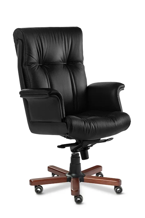 Кресло руководителя Paris Luxe А - наиболее престижная, проверенная временем модель категории "Бизнес", для руководящего звена. Выполняется с высокой спинкой, "Г"-образными мягкими подлокотниками и деревянными накладками на крестовине. Спинка и сидение уложены в фанерованный ковш, с внешней стороны обтянутый высококачественным кожзаменителем. Дизайн кресла сочетает в себе эргономичность и функциональность. Кресло оборудовано механизмом качания с регулировкой под вес и фиксацией в четырёх положениях ("Мультиблок"), а так же регулировкой высоты за счет установленного в крестовине кресла газо-масляного амортизатора (газпатрона) 3-ей категории стабильности (DIN 4550 class 3), категория повышенной надёжности: газпатрон выдерживает нагрузку в 200 тысяч циклов при динамической стендовой нагрузке в 80 кг. Максимальное давление, при котором срабатывает газпатрон - около 150 кг. Толщина поролона на сиденье и на спинке 80 мм. Применяемая марка поролона 30/40 (плотность/жесткость) обеспечивает долговечность кресла. Каркас кресла выполнен из высокопрочной гнутоклееной фанеры толщиной 17 мм. Чехол кресла выполнен из черной или цветной мебельной, натуральной кожи сквозного крашения со среднезернистым тиснением из цельных шкур крупного рогатого скота, задняя часть спинки по евростандарту из кожзама (компаньона) в цвет кожи. Толщина шкуры в стандартной точке 0,9-1,1мм. Для придания объемности и правильной эргономики чехла кресла - применяется холофайбер (марка 400). Все указанные материалы экологичные и износостойкие. Спинка и сидение чехла имеют схожий рисунок - это четыре вертикальные прострочки, в виде двух полос шириной 28 мм, и один горизонтальный шов шириной 7 мм, образуя вместе пересечения две точечные утяжки. Подлокотники кресла выполнены из гнутоклеенной фанеры натурального березового шпона, с подушкой из поролона, рабочая сторона обтянута натуральной кожей. Крестовина металлическая сварная из профильной трубы 25*25*1,5 мм выдерживает нагрузку до 150 кг, лучи крестовины закрыты декоративными накладками из массива бука, тонированных и покрытых шелковисто матовым полиуретановым лаком (производство Италия) в несколько слоев. Ролики - паркетные прорезиненные (обеспечивают сохранность паркета, ламината). Каждый ролик рассчитан на нагрузку в 30 кг.